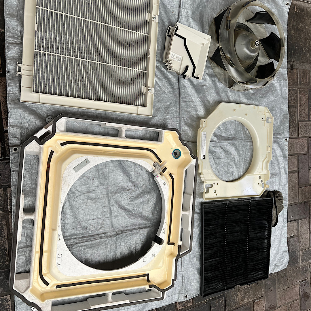 飲食店様の天井埋め込み型エアコン4台行いました。新品から2年が経ち、エアコンの効きが悪くなったとの事。熱交換器を高圧洗浄して、風量アップして、エアコンの効きも改善されて、喜んでありました。